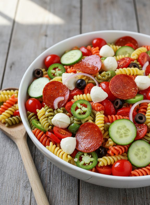 Make this colorful Italian pasta salad your potluck superstar—packed with fresh veggies, cheese and pepperoni in a tangy dressing.