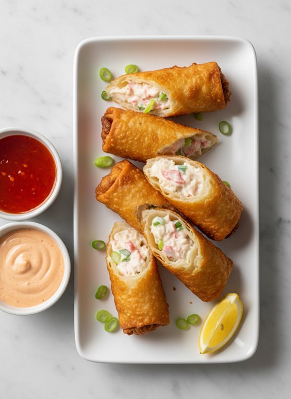 Crispy crab rangoon egg rolls combine two favorite appetizers into one irresistible bite that will leave your guests begging for more.