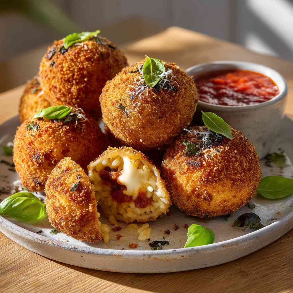 Savor these golden arancini di riso balls with their crispy exterior and gooey mozzarella center that will transport you to Sicily.